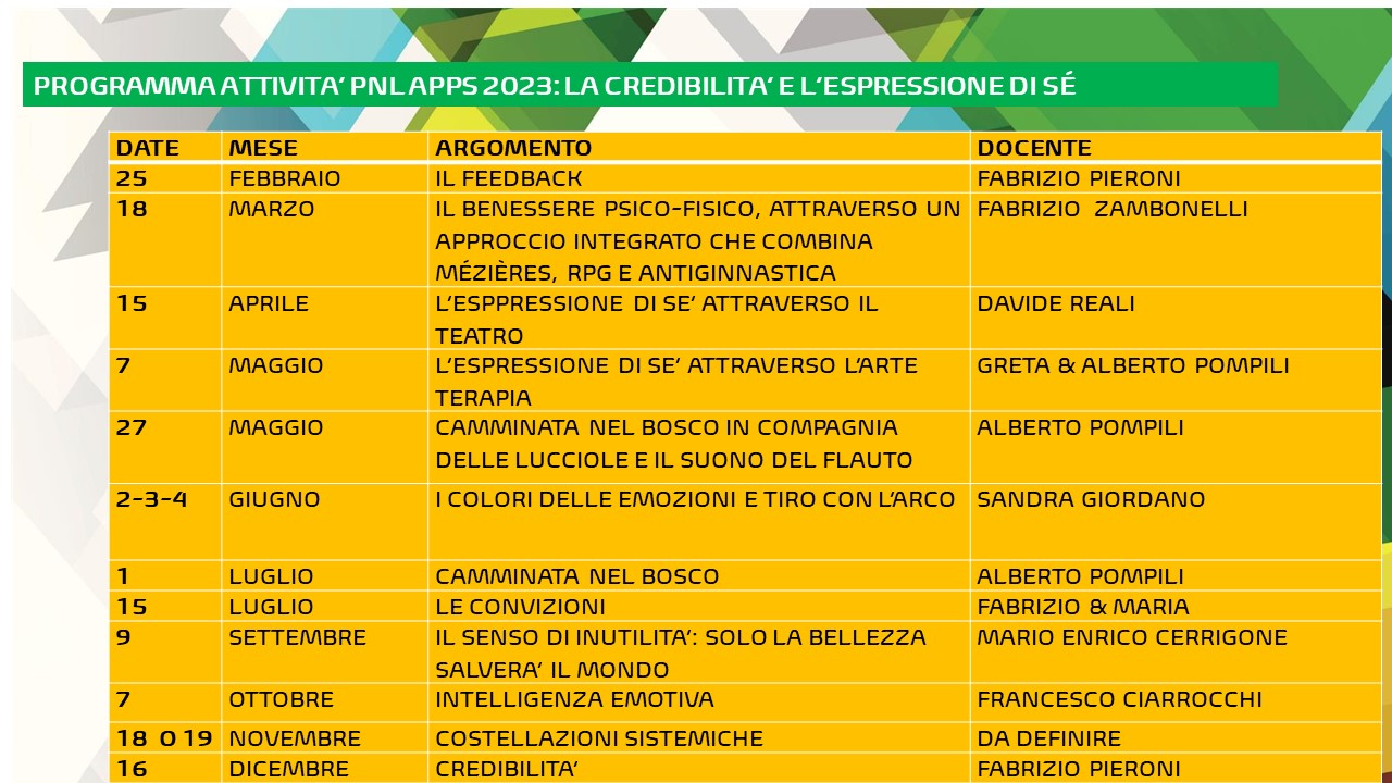 Anticipazione del Programma 2023 di PNL Apps Se ritieni che non siano rispettati i contenuti della Carta, Segnala questo contenuto 06 Febbraio 2023Anticipiamo quello che, più o meno, sarà il programma 2023 di PNL Apps. Qui potete vedere lo schema più chiaramente. emailfacebooklinkedintwittergoogle+pinterest fabrizio pieroni Post recenti dal blog Intenzionalità e Scelta Il desiderio e la società dei consumi Practitioner PNL a Bologna L'espressione di sè attraverso il teatro Anticipazione del Programma 2023 di PNL Apps Fiducia e Credibilità nella Comunicazione L’insostenibile sensazione di non essere all’altezza. Corso sul Metamodello PNL a Bologna 1° incontro PNL (corso PNL a buon prezzo) Corso online: Il Metamodello PNL 1 2 3 4 5 seguente › ultima »