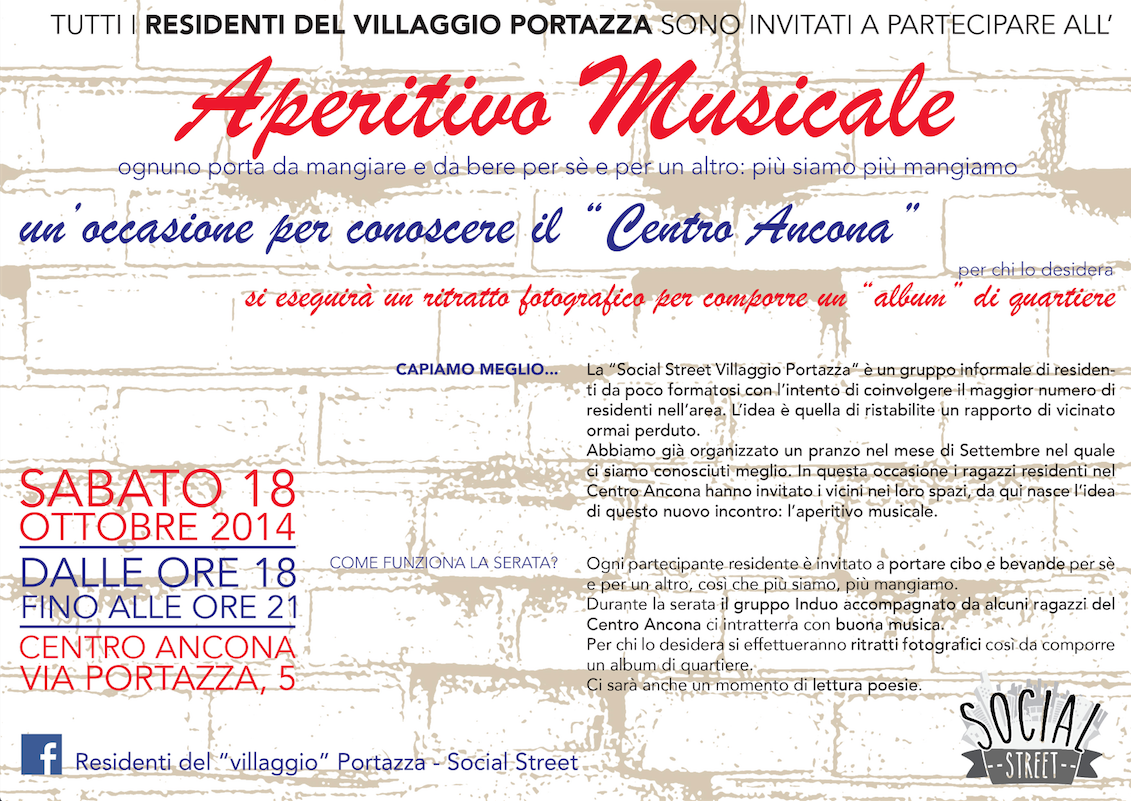 Aperitivo Musicale dal blog di Social Street _ Villaggio Portazza Se ritieni che non siano rispettati i contenuti della Carta, Segnala questo contenuto 17 Dicembre 2014 aperitivomusicacorteobandaroncatistradasocialitàemailfacebooklinkedintwittergoogle+pinterest Social Street _ Villaggio Portazza Post recenti dal blog Aperitivo al Centro Ancona Trekking Fotografico Aperitivo Musicale Primo Pranzo di Vicinato