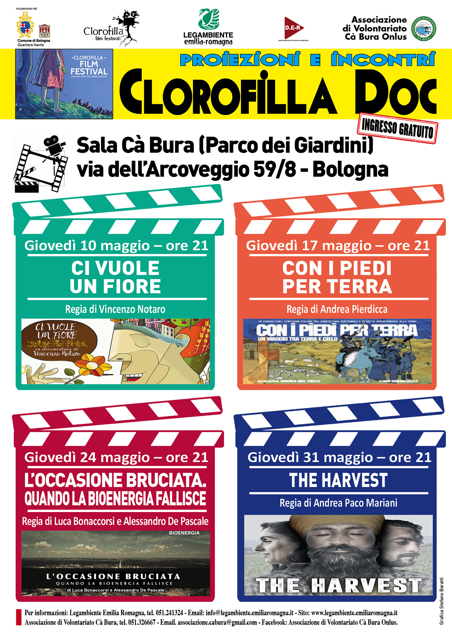 Associazione di volontariato Ca’ Bura Onlus, Legambiente Emilia-Romagna Onlus e Oasi dei Saperi organizzano la prima edizione bolognese di Clorofilla DOC. Quattro serate nello spazio dell’Associazione Ca’ Bura all’interno del Parco dei Giardini a Corticella, con altrettante proiezioni di documentari ambientali selezionati dal Clorofilla Film Festival, ed incontri con la presenza dei registi.