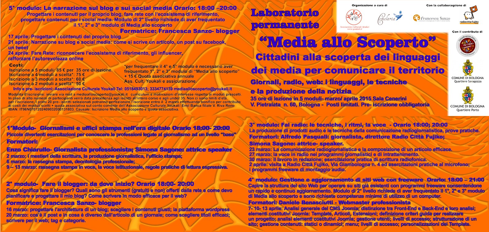 Sono aperte le iscrizioni al laboratorio permanente sulla comunicazione “Media allo scoperto” promosso dalle Associazioni Youkali e Come L’Aria e cofinanziato dai Quartieri Saragozza e Porto attraverso il regolamento di Cittadinanza attiva. Il 2 marzo, alle ore 18, presso la Sala Cenerini di Via Pietralata 60 si attiverà il primo dei 5 moduli del progetto di formazione, che prevede, in questa prima fase progettuale, 35 ore di laboratorio.