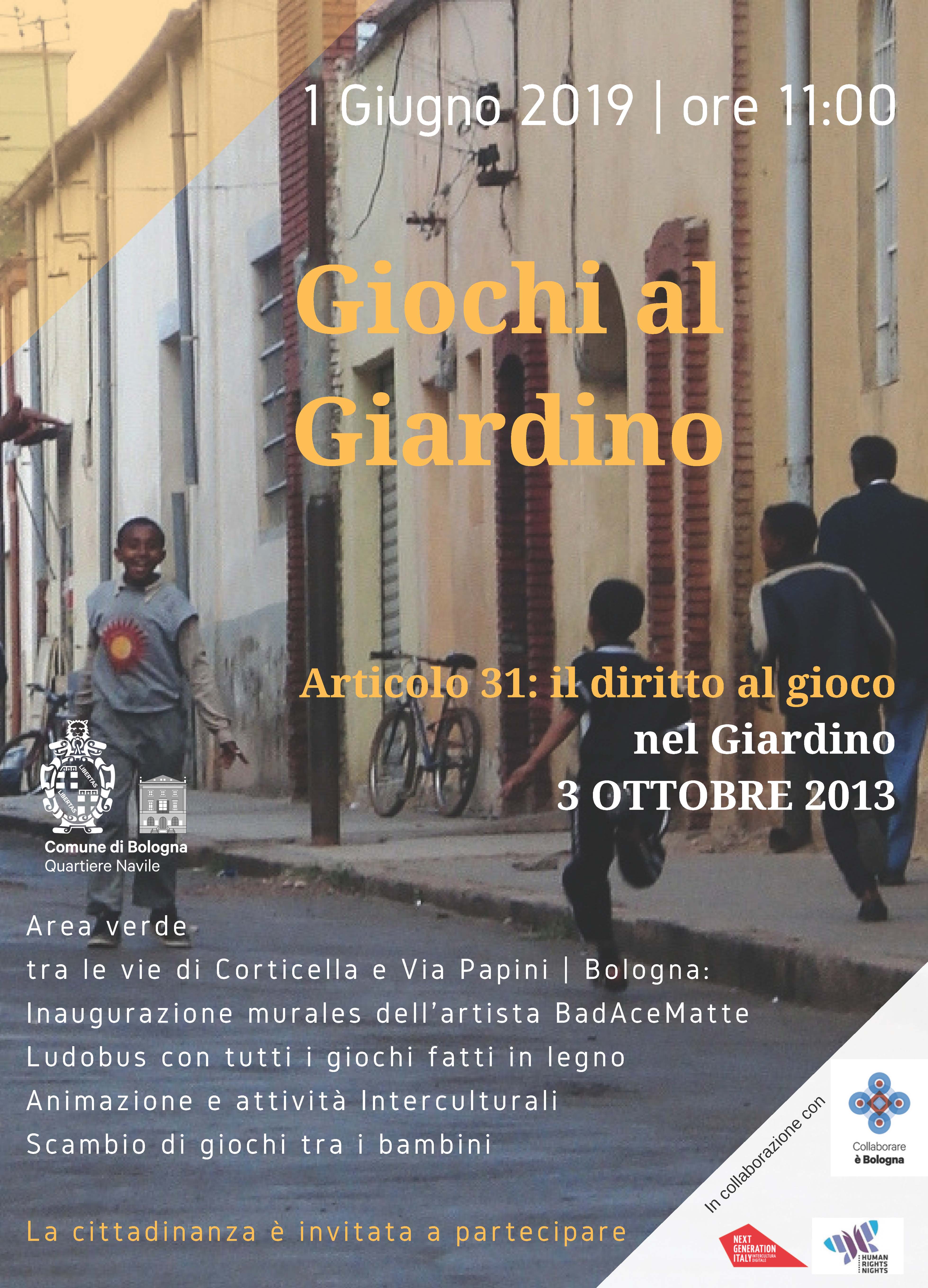 L'Associazione Next Generation Italy che si occupa riqualificazione del giardino 3 Ottobre 2013, presenta l'evento giochi al Giardino, 1 giugno 2019 ore 11.00.