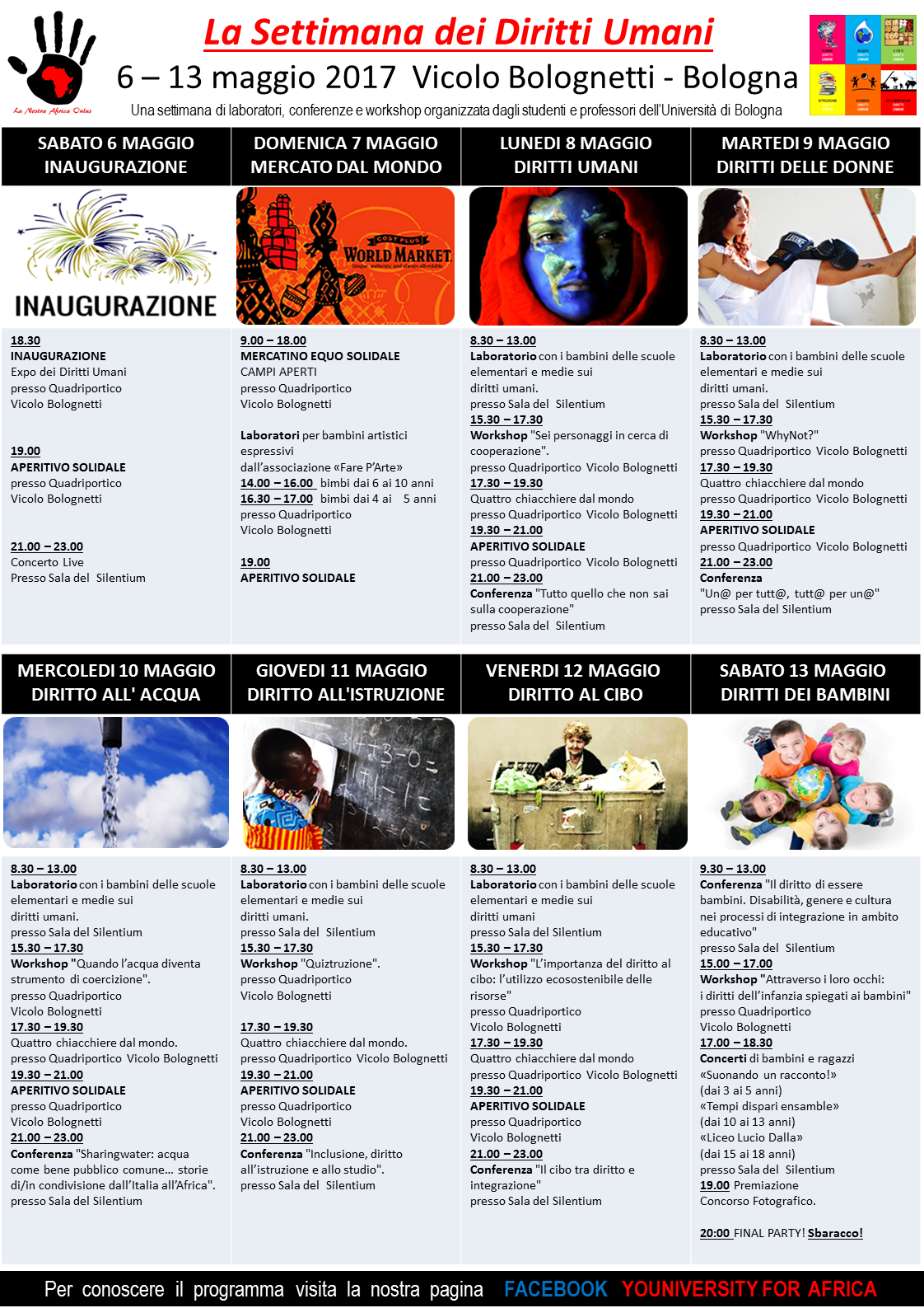 La settimana dei Diritti Umani viene organizzata dall’associazione di volontariato La Nostra Africa Onlus, in collaborazione con dell’ Alma Mater Studiorum– Università di Bologna, il patrocinio del Comune di Bologna, di Città Metropolitana di Bologna e verrà svolta presso il Vicolo Bolognettia Bologna, dal 6 al 13 maggio 2017. L’obiettivo di tale evento è quello di sensibilizzare la cittadinanza bolognese al tema sempre più centrale dei diritti umani spesso violati e ignorati in luoghi geograficamente e culturalmente sempre più vicini a noi. La settimana dei Diritti Umani nasce all’interno del progetto «YoUniversity», nato come progetto volto a creare una collaborazione tra universitari e professori al fine di realizzare campagne di sensibilizzazione sui diritti delle donne, sul diritto all’acqua, sul diritto all’istruzione, sul diritto al cibo, sui diritti dei bambini ed, infine, sulla cooperazione allo sviluppo.