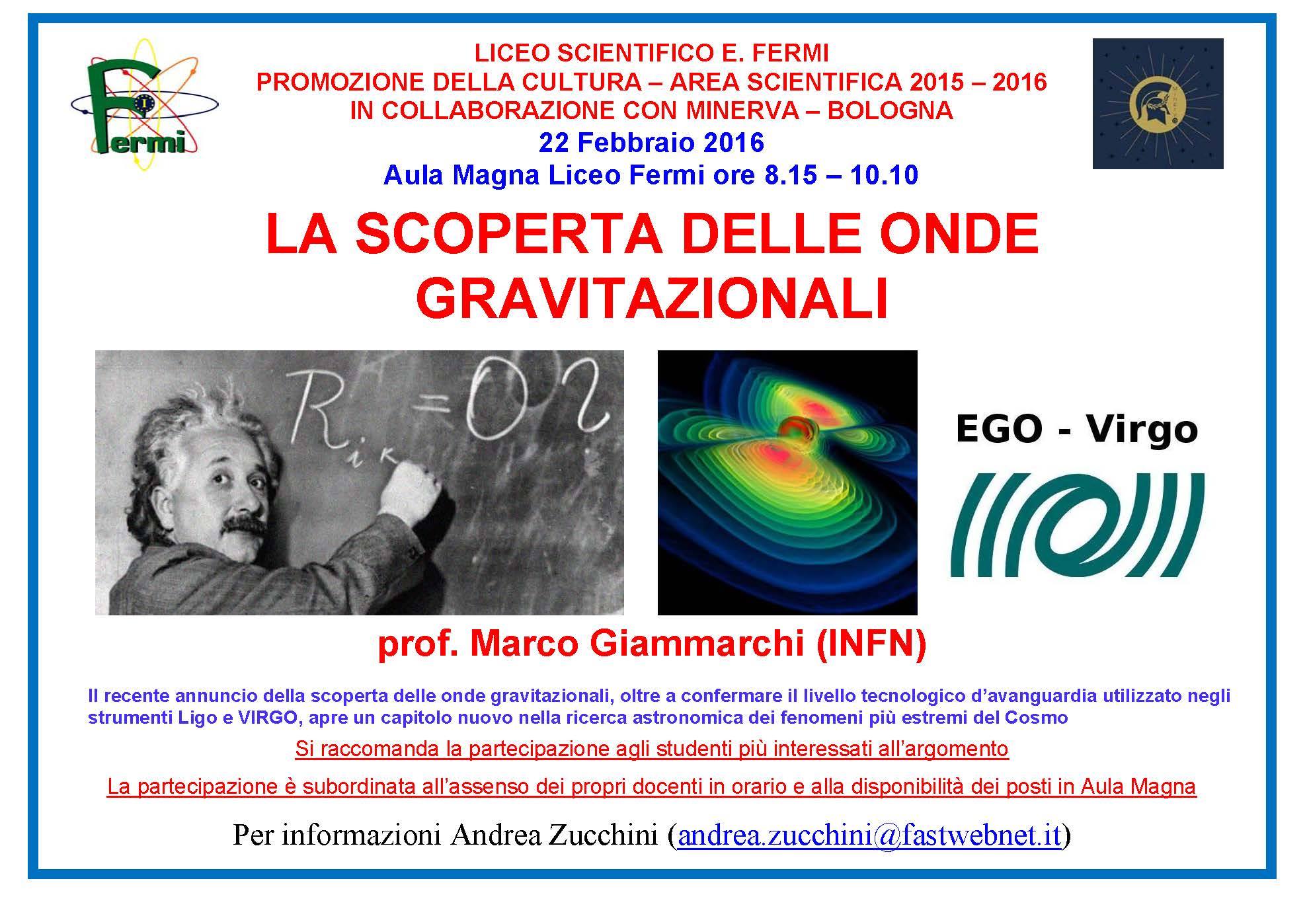 Lunedì 22 Febbraio il prof. Marco Giulio Giammarchi dell'Istituto Nazionale di Fisica Nucleare si è tenuto un seminario sulle onde gravitazionali presso il liceo scientifico 'E. Fermi' di Bologna.