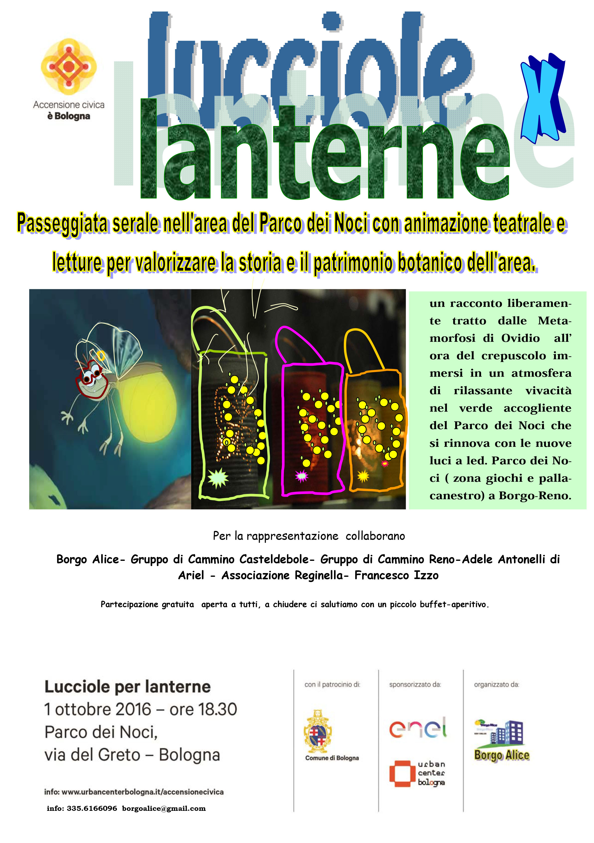 Nell'ambito del progetto "Accensione Civica", Borgo Alice propone l'evento "Lucciole x Lanterne", una visita guidata serale nel Parco Dei Noci di Borgo Panigale per un racconto alternativo sulle alberature presenti, evocando il mito della metamorfosi. Un racconto coinvolgente e partecipato rivolto al Gruppo di Cammino e ai cittadini di ogni età per contribuire ad una maggiore conoscenza del territorio in una lettura suggestiva con le nuove luci a Led in una serata di novilunio. La passeggiata serale è prevista per la giornata di sabato 1° ottobre all’ora del crepuscolo con la partenza dei Gruppi di Cammino da Casteldebole e dalla località Treno in zona Barca per raggiungere il Parco dei Noci zona di giochi per bambini e Basket dove rappresentiamo la vicenda di Fetonte che muore rovinosamente folgorato da Giove per aver voluto incautamente provarsi alla guida del cocchio dai quattro cavalli alati del padre Apollo dio del Sole. L’epilogo della vicenda chiude con la metamorfosi delle ninfe Eliadi, tutte sorelle di Fetonte, che, inscenato un lungo lamento funebre durato quattro lune per la sua drammatica morte, e per il volere e la pietà di Giove, si trasformano e si fondono in alberi di pioppo e di tiglio elaborando il lutto col mutarsi del lamento e del pianto in un più gentile fruscio di foglie al lieve vento d’inizio d’autunno.
