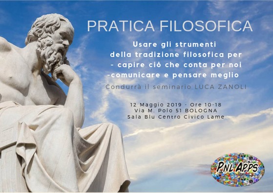 PNL Apps organizza per il 12 maggio 2019, (ore 10-18) presso la sala Blu del Centro Civico Lame, in via M. Polo 51 a Bologna, un seminario intitolato, “FILOSOFIA APPLICATA”, condotto da Luca Zanoli.