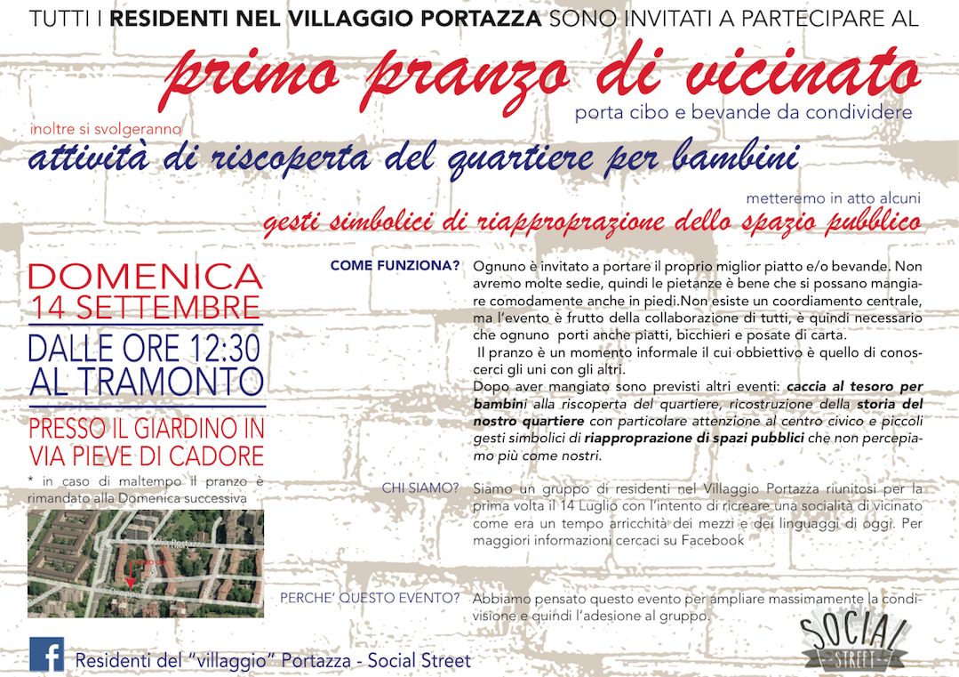 Primo Pranzo di Vicinato dal blog di Social Street _ Villaggio Portazza Se ritieni che non siano rispettati i contenuti della Carta, Segnala questo contenuto 17 Dicembre 2014 pranzosocialecondivisionesocial streetriappropriazioneverde pubblicoemailfacebooklinkedintwittergoogle+pinterest Social Street _ Villaggio Portazza Post recenti dal blog Aperitivo al Centro Ancona Trekking Fotografico Aperitivo Musicale Primo Pranzo di Vicinato