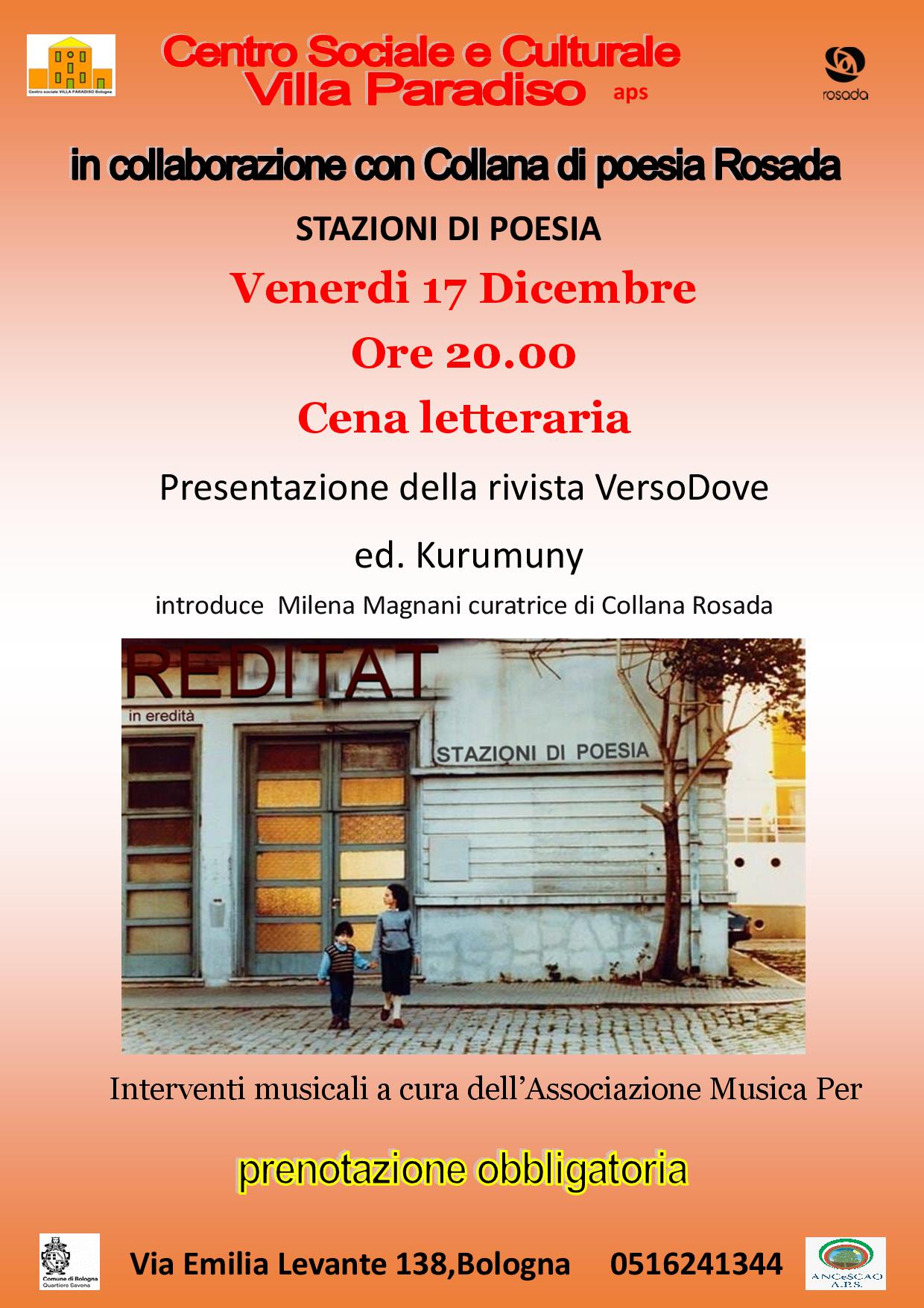 Il Centro Sociale Culturale Villa Paradiso aps intende realizzare, in collaborazione con altre realtà associative del territorio, un centro di produzione culturale che abbia come centralità la poesia in una forma espressiva di realtà quotidiane e che possa contribuire a ricostruire socialità, espressione del disagio e come interpretarlo e condivisione di esperienze. In prospettiva si potranno coniugare letture e scritture con l’ambiente circostante anche all’aperto.