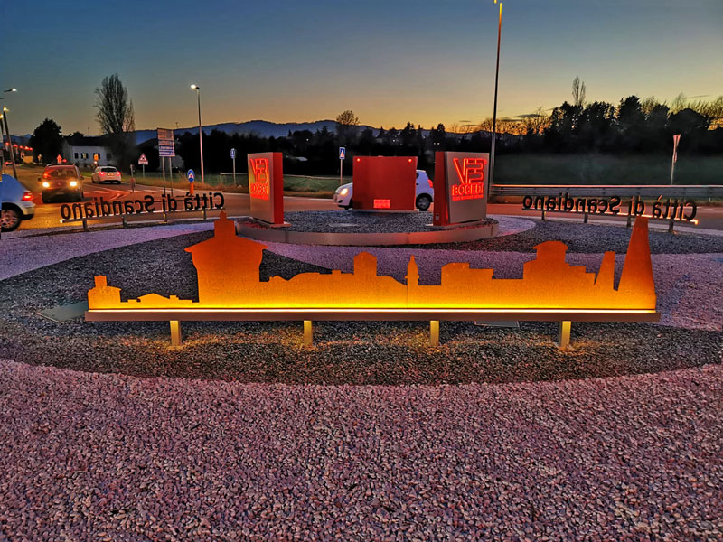 Il ferro corten andrebbe a richiamare sia le radici storiche ferroviarie del comparto, che il materiale di cui saranno composte le barriere antirumore a protezione di quello che sarà il parco di fronte alla rotonda. Entrambe le insegne illuminate con una striscia led colore rosso/rosso-blu per renderle visibili anche di notte.