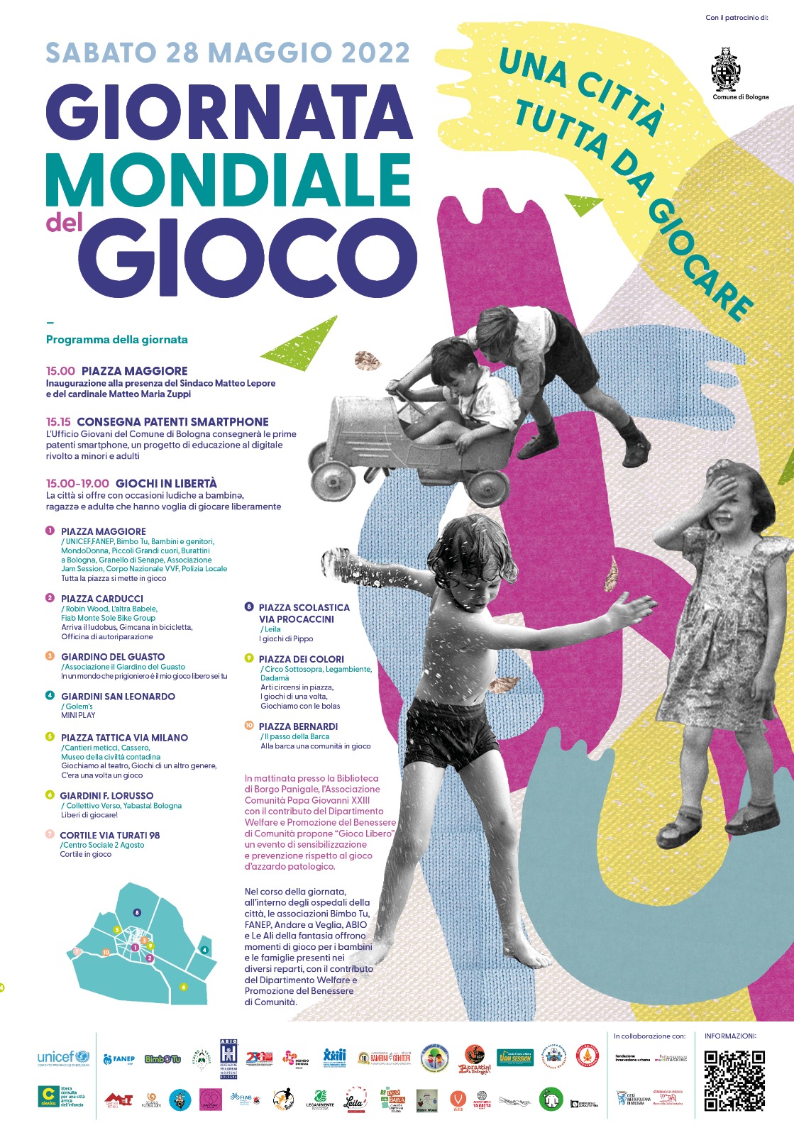 Cinnica - Libera consulta per una città amica dell'infanzia propone la realizzazione, il 28 maggio 2022, in occasione della Giornata Mondiale del Gioco, la realizzazione, sui territori dei Quartieri cittadini e in aree scelte d'intesa con essi e la collaborazione di Fondazione Innovazione Urbana, di momenti di gioco e socialità dedicati a bambini e adolescenti.  Nei luoghi scelti si svolgeranno azioni diverse legate alle peculiarità dei territori,  al movimento, alla produzione artistica, alla costruzione o ai giochi della tradizione. Prediligendo scelte di sostenibilità ambientale verranno diversificate le opportunità di gioco libero, stimolando interazioni, creatività, espressività.